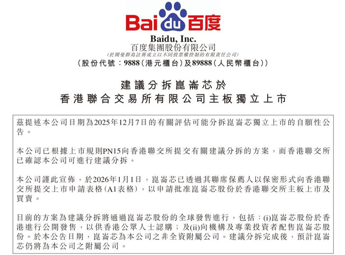 1月2日,百度集团(09888.HK)发布公告,宣布其非全资附属公司昆仑芯(北京)科技股份有限公司已于2026年1月1日通过联席保荐人以保密形式向香港联合交易所提交上市申请表格,申请在港交所主板独立上市及买卖。